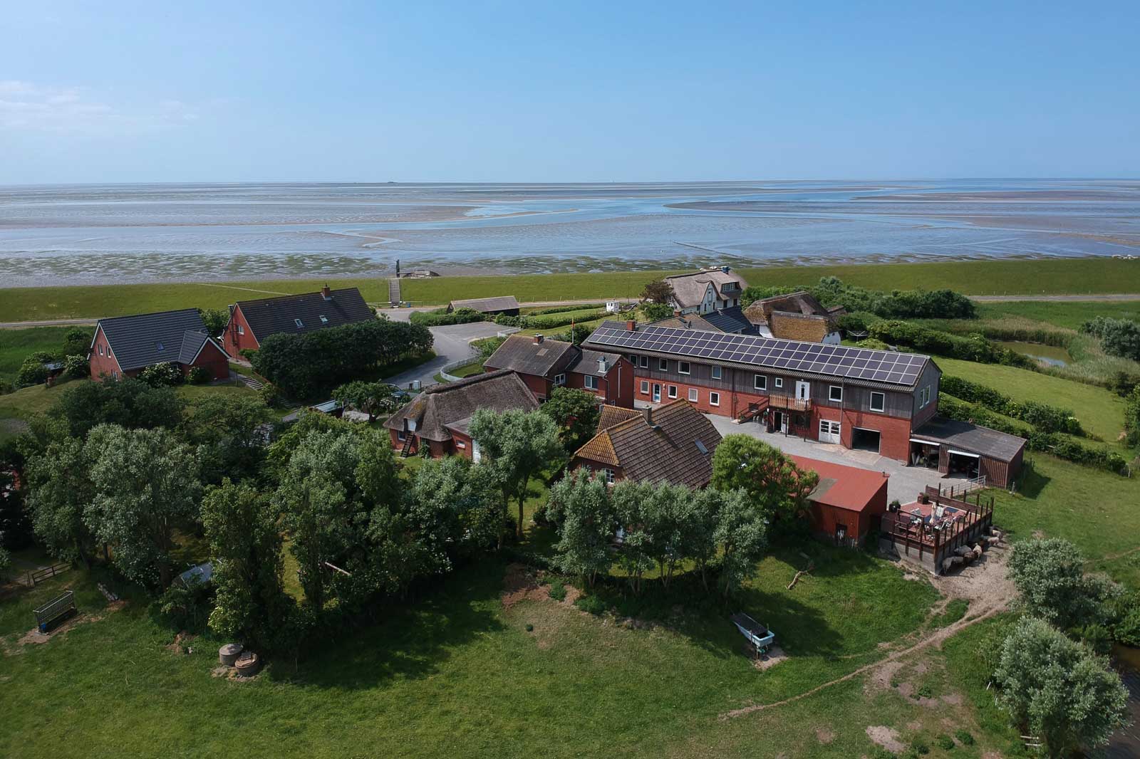 Die Nordsee ist zum Greifen nahe und Sie können die Sonnenauf- und untergänge auf dem nahegelegenen Deich in vollen Zügen genießen. Die Ferienwohnungen befinden sich im 1.Stock und da das Haus auf einem der höchstgelegenen Punkte der Nordseeinsel gelegen ist, haben Sie aus jeder Wohnung Aussicht über den Deich hinweg auf das Wattenmeer.